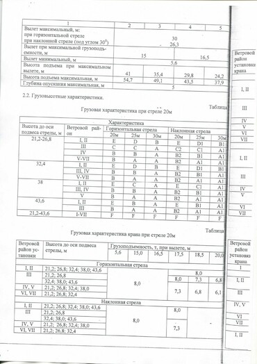 Высота подъёма крана 45 метров. Длина горизонтальной стрелы 60 метров. Грузоподъемность 6 тонны, грузоподъемность на конце стрелы 1,9 тонны.